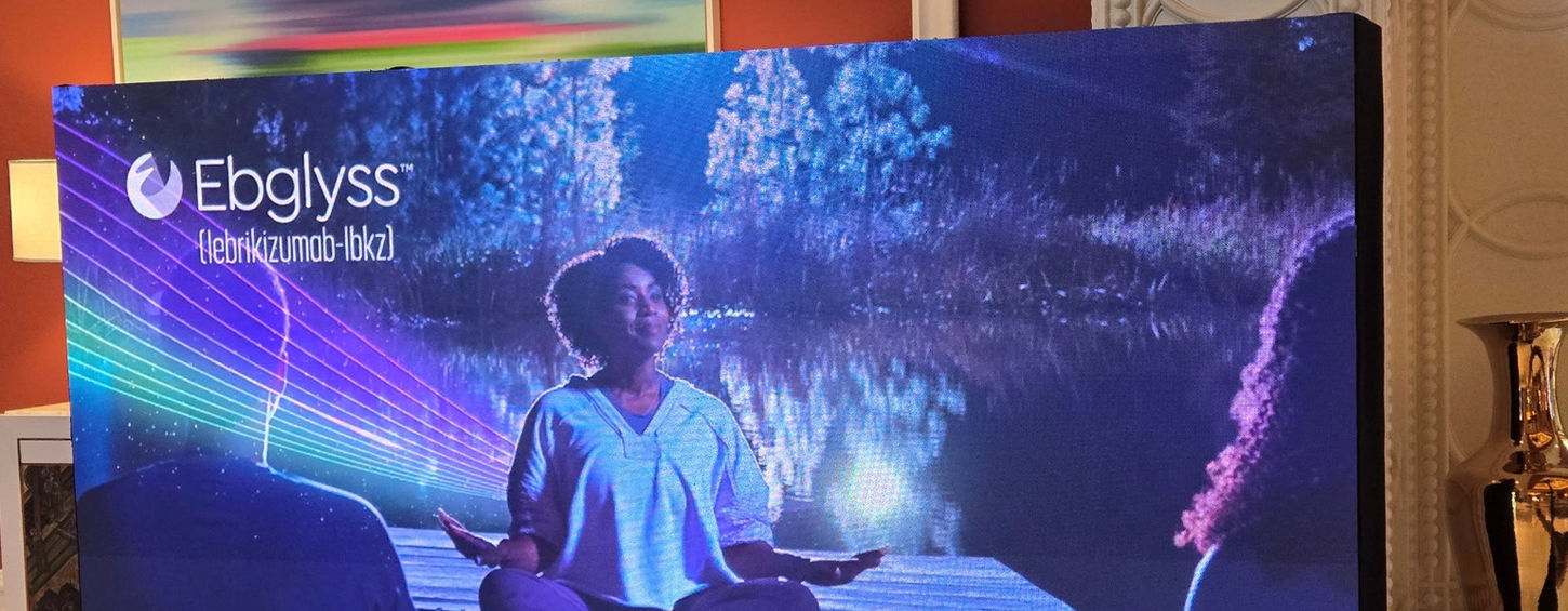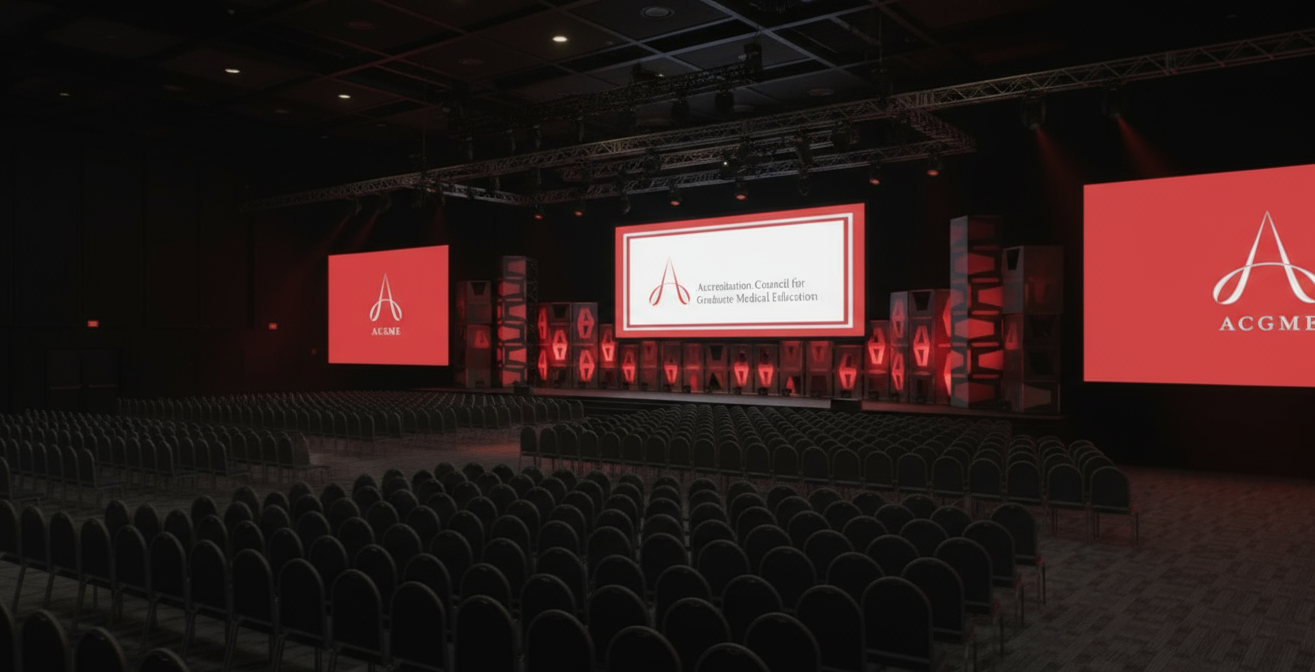 This stage was imagined as a space of transformation – three luminous canvasses rising from a backdrop of sculpted light. The central screen anchors the story of ACGME’s mission, while the sweeping vertical ribbons suggest progress, continuity and growth.